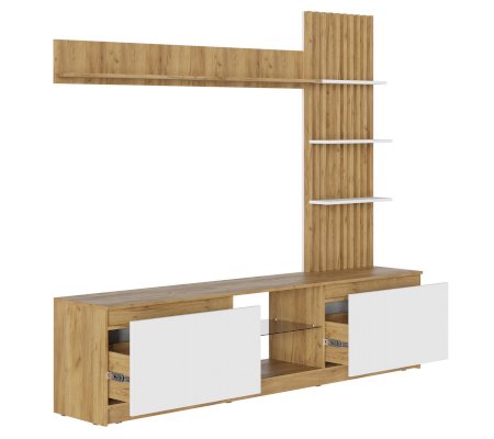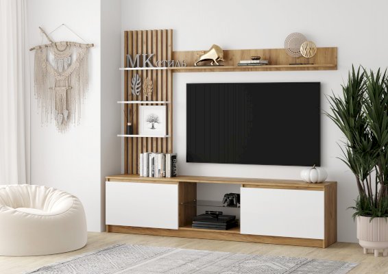 Ниша под телевизором оборудована стеклополкой из тонированного стекла в цвете Графит, края обработаны еврокромкой